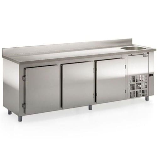 Balcão De Encosto Com 3 Portas E 1 Pia Lado Direito Gbfe250cd Gelopar Balcão 765 Litros Inox 220v Balcão de Encosto 3 Portas e 1 Pia 765 Litros GBFE250CDAI Gelopar. Conservador e Expositor de frios, laticínios, bebidas e alimentos diversos não congelados. Ideal para cozinhas industriais de hotéis, restaurantes, clubes, bares, lanchonetes, confeitarias, mercados, mercearias e outros. Temperatura: 0 a +7C. Refrigeração: Ar forçado com evaporador aletado. Controlador eletrônico com indicador de temperatura. Degelo automático (frost free). Portas: Cegas. Prateleiras: 1 nível aramadas e regulável. Resistência no quadro de portas. Revestimento interno em aço galvanizado. Revestimento externo do tampo em aço inox 304 escovado, gabinete em aço inox 430 e traseira e fundo em aço galvanizado. Tampo com cuba de 40x34x13cm. Tampo liso, sem rebaixo. Pés niveladores. Motor do lado direito, para quem está de frente para as portas. com cuba GN e caixa euronorm. Pia do lado direito. ATENÇÃO: não acompanha torneira e sifão. CAPACIDADE: 765L. TEMPERATURA: 0 a +7C. CONSUMO: 6,7 kWh/dia. PESO: 114kg. DIMENSÕES EXTERNAS (CxAxL): 250x100/90x70cm. Equipamento certificado conforme Portaria Inmetro n 371/2009. Balcão de Encosto 3 Portas e 1 Pia 765 Litros GBFE250CDAI Gelopar é na Atau. Marca - Gelopar Modelo - GBFE250CDAI Capacidade - 765 Litros Portas - 3 Altura - 100cm Temperatura - 0 a +7C Profundidade - 70cm Frente - 250cm Peso - 114kg Consumo - 6,7 kWh/dia