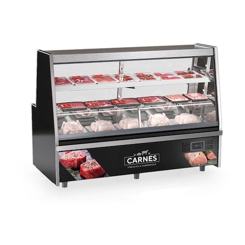 Balcão Frigorifico Avícola Linha Turino 2MT GRTA200 Gelopar. Conservação e exposição de carnes e aves (não congeladas). Refrigeração: Estática com 1 placa fria (prateleira) e serpentina de cobre. Temperatura: 0 a +7C. Degelo: Manual. Controlador eletrônico com indicador de temperatura. Revestimento Interno: Revestimento interno em aço inox 430. Revestimento Externo: Laterais em aço injetado, parte externa pré pintada, parte interna aço inox. Iluminação LED (interna), com interruptor. 2 níveis (1 nível placa fria e 1 aramado). Grades nas placas frias. Pés niveladores. Capacidade da placa fria / prateleira: 15kg/metro por prateleira. Vidros sujeitos a condensação da umidade do ar. Vidro frontal temperado, baixo emissivo. CAPACIDADE: 1019 L. PESO: 161kg. TEMPERATURA: 0 a +7°C. CONSUMO: 7,25 kWh/dia. DIMENSÕES EXTERNAS (CxAxL): 200x146,2x96,5cm. Equipamento certificado conforme Portaria Inmetro nº 371/2009. Balcão Frigorifico Avícola Linha Turino 2MT GRTA200 Gelopar é na Atau.