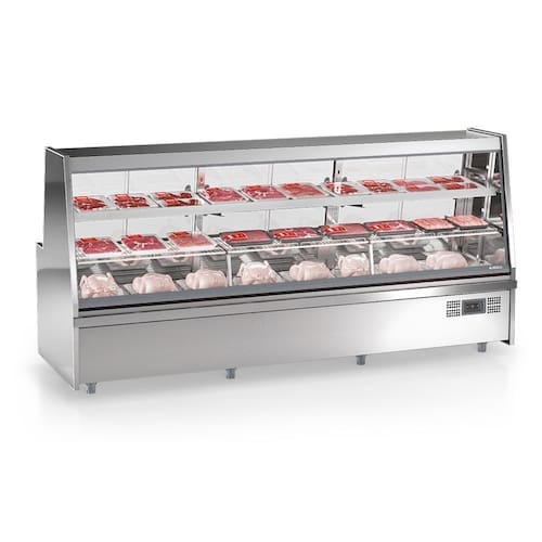 Balcão Frigorifico Avícola Linha Turino 3MT GRTA300 Gelopar. Conservação e exposição de carnes e aves (não congeladas). Refrigeração: Estática com 1 placa fria (prateleira) e serpentina de cobre. Temperatura: 0 a +7C. Degelo: Manual. Controlador eletrônico com indicador de temperatura. Revestimento Interno: Revestimento interno em aço inox 430. Revestimento Externo: Laterais em inox (AI), parte interna aço inox espelhado. Iluminação LED (interna), com interruptor. 2 níveis (1 nível placa fria e 1 aramado). Grades nas placas frias. Pés niveladores. Capacidade da placa fria / prateleira: 15kg/metro por prateleira. Vidros sujeitos a condensação da umidade do ar. Vidro frontal temperado, baixo emissivo. CAPACIDADE: 1546 L. PESO: 219kg. TEMPERATURA: 0 a +7°C. CONSUMO: 9,5 kWh/dia. DIMENSÕES EXTERNAS (CxAxL): 300x146,2x96,5cm. Equipamento certificado conforme Portaria Inmetro nº 371/2009. Balcão Frigorifico Avícola Linha Turino 3MT GRTA300 Gelopar é na Atau.