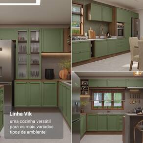 O acabamento de alta resistência da estrutura é em amadeirado Rustic e das portas em Verde. Possui uma textura suave ao toque, trazendo leveza e sofisticação ao ambiente. O destaque fica por conta dos puxadores ponto em ouro envelhecido, feitos com metal resistente, trazem personalidade e um charme único. Outro diferencial está no detalhe chanfrado das frentes, que forma molduras elegantes e dá profundidade, refletindo o estilo americano com um toque moderno.