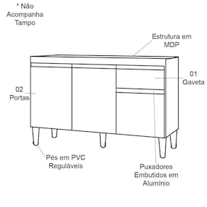 Características do Balcão para Cozinha 1 Gaveta: - Estrutura em MDP; - Pintura UV com acabamento padrão; - 3 portas com dobradiças metálicas; - Puxadores embutidos; - 1 gaveta com corrediça metálica; - 1 prateleira; - Pés em PVC; - Não acompanha tampo; - Não acompanha objetos de decoração;