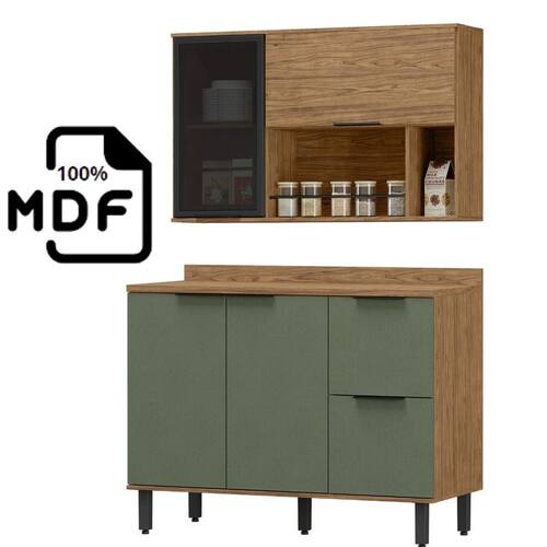 Oferece um amplo espaço interno, o balcão possui 2 portas e 3 Gavetas (sendo 1 Interna) para deixar a sua cozinha muito organizada e com muito estilo, já o aéreo possui 2 portas sendo uma basculante e outra com vidro fumê e com nichos para decoração.