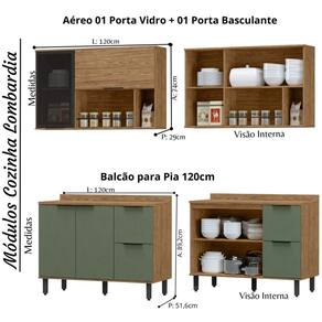 Balcão = Altura: 89,5CM|Comprimento: 120CM | Profundidade: 51,6CMAéreo = Altura: 74CM|Comprimento: 120CM | Profundidade: 29CMTampo = Altura: 22MM|Comprimento: 120CM | Profundidade: 51,6CM