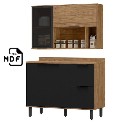 Balcão de pia 1,20 com Tampo + Armário Aéreo em MDF Lombardia - Freijó Nero - Preto