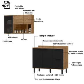 Oferece um amplo espaço interno, o balcão possui 2 portas e 3 Gavetas (sendo 1 Interna) para deixar a sua cozinha muito organizada e com muito estilo, já o aéreo possui 2 portas sendo uma basculante e outra com vidro fumê e com nichos para decoração.