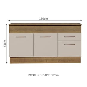 O balcão ainda acompanha tampo, que pode ser recortado para a colocação de pia de inox ou pedra no tamanho de 150 cm de largura x 52 cm de profundidade.