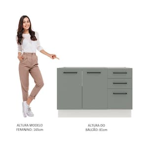 Os pés são reguláveis em PVC e o rodapé é removível para facilitar a limpeza. O espaço para a colocação de tampo ou pia é de 120 cm de largura por 52 cm de profundidade.