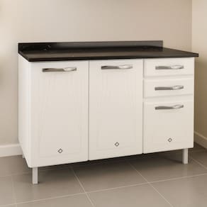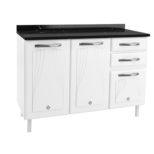 Caracteristicas: 2 Gavetas que suportam ate 3kg com corredicas metalicas 1 Prateleira interna que suporta ate 15kg 3 Portas com apliques resinados Acompanha tampo que suporta ate 30kg Acabamento em pintura eletrostatica e anticorrosiva Estrutura em aco e polipropileno Possui pes regulaveis e puxadores de plastico Revestimento BF