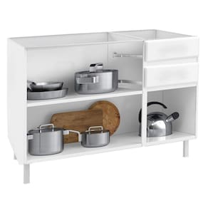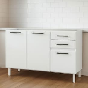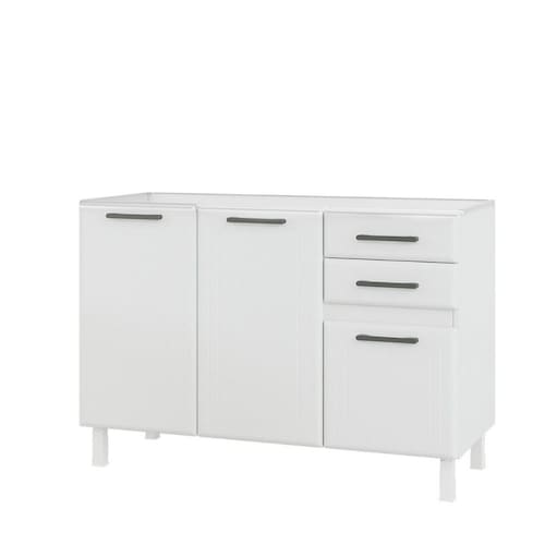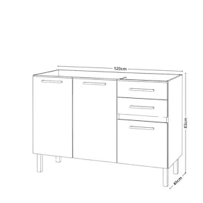 Caracteristicas: 2 Gavetas 3 Portas com detalhes na vertical 1 Prateleira interna Design sofisticado Estrutura em Aco e MDP BP Nao acompanha Pia Possui pes com regulavel Puxador em poliestireno