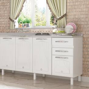 O Balcao de Pia em Aco 4 Portas 2 Gavetas 160cm sem Pia Star New Telasul e ideal para organizar sua cozinha com funcionalidade e estilo. Possui 4 portas com apliques resinados e 2 gavetas com corredicas metalicas que suportam ate 3kg cada. Sua estrutura em aco com revestimento BF e pintura eletrostatica anticorrosiva garante resistencia e durabilidade. Conta com prateleira interna que suporta ate 15kg, base reforcada para ate 30kg, pes regulaveis e puxadores em plastico. Nao acompanha tampo.