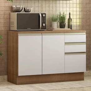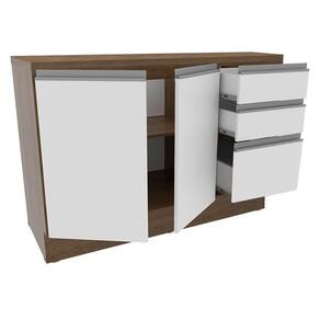 É desenvolvido com materiais de alta qualidade, como puxadores em alumínio e dobradiças metálicas com amortecimento. Conta com duas portas e três gavetas com corrediças telescópicas, sendo uma delas maior.