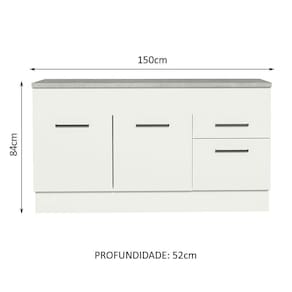 O balcão ainda acompanha tampo, que pode ser recortado para a colocação de pia de inox ou pedra no tamanho de 150 cm de largura x 52 cm de profundidade.