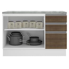 É desenvolvido com materiais de alta qualidade, como puxadores em alumínio e dobradiças metálicas com amortecimento. Conta com duas portas e três gavetas com corrediças telescópicas, sendo uma delas maior. É ideal para panelas, utensílios, louças, talheres, eletroportáteis e o que mais você necessitar.