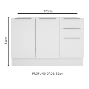 Os pés são reguláveis em PVC e o rodapé é removível para facilitar a limpeza. O espaço para a colocação de tampo ou pia é de 120 cm de largura por 52 cm de profundidade.