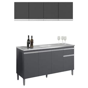 Balcão de Pia Tatiane 145 cm e Armário Aéreo Andréia 4 Portas 150 cm Cinza Fosco – AJL