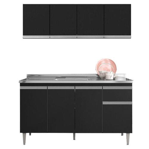 Balcão de Pia Tatiane 145 cm e Armário Aéreo Andréia 4 Portas 150 cm Preto Fosco AJL