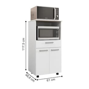 O Balcão é produzido em MDP de 12 e 15mm., com madeira reconstituída, que respeita o meio ambiente. Composto de duas portas e uma ampla gaveta onde são utilizadas dobradiças e corrediças 100% metálicas, nicho para micro-ondas com passa fio que facilita o acesso a tomadas na parede e tampo para forno elétrico ou outro eletroportátil. Os puxadores são ergonômicos em plástico resistente (poliestireno) com acabamento cinza e ponteiras metalizadas. Possui quatro rodizios em plástico resistente (poliestireno) que facilitam a movimentação do produto. Móvel perfeito para quem procura organizar seus ambientes.
