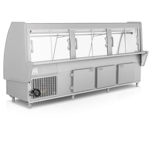 Balcão Frigorífico Açougue com Depósito POP GAPS310DCZ Gelopar. Ideal para açougues, supermercados, casas de carnes e similares. Conservação e Exposição de carnes não congeladas. Temperatura 0 a +7C. Refrigeração estática com evaporador aletado na parte superior e placa fria na base. Controle de Temperatura: Termostato. Termômetro analógico. Degelo é manual. Iluminação LED interna, com interruptor. Tendal simples em alumínio com ganchos. Cabeceira: externo em aço pré-pintado, interno plástico. Revestimento interno branco, revestimento externo cinza. Pés niveladores. Vidros temperados sujeitos a condensação da umidade do ar. ATENÇÃO: não acompanha bandejas em aço inox. TEMPERATURA: 0 a +7°C. CONSUMO: 17,50kWh/dia. PESO: 240kg. DIMENSÕES(CxAxL): 309,3x146,1x92,9cm. Equipamento certificado conforme Portaria Inmetro nº 371/2009. Balcão Frigorífico Açougue com Depósito POP GAPS310DCZ Gelopar é na Atau.