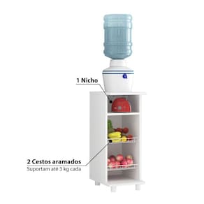 Características - Cor: Branco. - Estrutura em MDP 15mm e fibra 3mm (costa). - Acabamento em BP. - 2 Cestos Aramados. - 1 Nicho. - Pés em PVC. - Suporta: 14 kg no topo/ 3 kg no cesto/ 4 kg na prateleira. - Móvel entregue desmontado.
