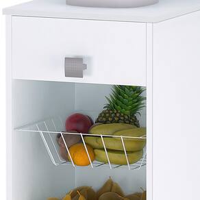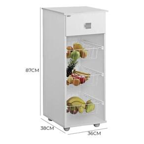 ESPECIFICAÇÕES: Estrutura MDP Pintura UV 1 Gaveta Corrediças metálicas 3 Cestos de metal aramados para acomodar frutas e legumes Tampo resistente com espaço destinado a filtro de água ou outros utensílios domésticos Puxador em PVC Pés em PVC