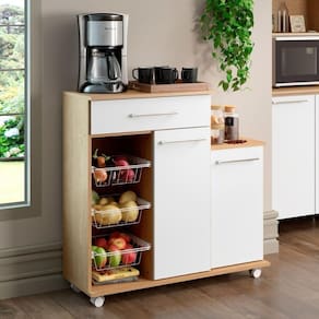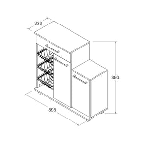Cestos/Fruteiras em aramado. Puxadores cromados produzidos em polímeros, posui também rodizíos.