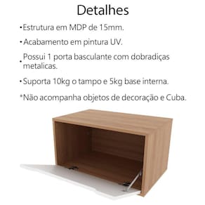 Balcão Gabinete 60 cm 1 Porta Basculante BN3646, ideal para inovar o seu banheiro com toque luxuoso e ao mesmo tempo refinado. Estrutura em MDP de 15mm, proporcionando maior durabilidade e resistência a peça, contando com acabamento em pintura UV. Composto por 1 porta basculante com frente usinada, possui articulador e dobradiças metálicas. Suportando 10kg o tampo e 5kg a base interna. Perfeito para deixar seu ambiente produtivo, proporcionando uma ambientação elegante e moderna. Este móvel chegará na sua casa separado em 1 volume.