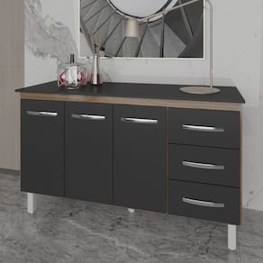Características do Balcão: Altura com pés: 83,5 cm Altura sem pés: 67 cm Largura: 138 cm Profundidade: 50 cm Material: MDP (Madeira de Média Densidade) Portas: 2 portas Gavetas: 3 gavetas Prateleiras: 1 prateleira Puxadores: 5 puxadores plásticos cromados Pés: 5 pés reguláveis de plástico Altura dos pés: 16,5 cm Regulagem dos pés: Ajuste máximo até 18 cm, apenas para nivelamento Corrediças: Metálicas Indicação de uso: Cozinha