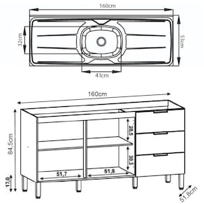 Balcão: 160 cm x 84,5 cm x 51,8 cm.
