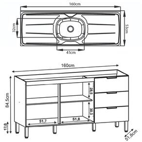 Balcão: 160 cm x 84,5 cm x 51,8 cm.