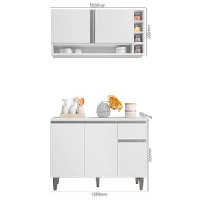 Que tal o Balcão Gabinete de Cozinha e Armário Aéreo Vanessa?Pensando em praticidade e funcionalidade, o Balcão Gabinete de Cozinha e Armário Aéreo Vanessa possui espaço para deixar seus utensílios e eletrodomésticos sempre bem acomodados, o balcão possui 3 portas, 1 prateleira, pés em PVC e 1 gaveta com corrediças metálicas, perfeitos para guardar seus talheres, panelas e mantimentos. Já o Armário suspenso conta com 2 portas, 1 prateleira e 1 nicho com 4 repartições para guardar temperos, potes, pratos e tudo o que precisar. Ambos os móveis, são produzidos em MDP, acabamento em pintura UV, puxadores embutidos e dobradiças metálicas, garantindo resistência e durabilidade ao móvel. Compre já!Dimensões por Módulo:Armário Aéreo: 105 x 50 x 38 cmBalcão Gabinete: 105 x 79 x 38 cmTampo do Balcão: 105 x 1,5 x 38 cmPeso Aproximado: 40 KgCaracterísticas:Material da Estrutura: MDP 15 mmMaterial do Fundo: MDF 3 mmPeso Suportado: 30 Kg distribuídos por móduloAcompanha Tampo: SimAcabamento: Pintura UVEscala de Brilho: BrilhanteQuantidade de Portas: 5 portasMaterial da Porta: MDP.Tipo de Porta: ConvencionalQuantidade de Gavetas: 1 gavetaMaterial da Gaveta: MDPTipo de Puxador: PlásticoTipo de Corrediças: MetálicasPossui Pés: Sim.Tipo de Pés: PVCAmbiente Principal: CozinhaTipo de Produto: Cozinha Compacta, Kit de Cozinha, Conjunto de CozinhaPossui Manual de Montagem: SimDiferenciais:- Design Moderno.- Amplo Espaço Interno.