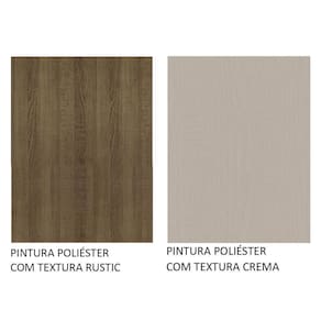 O acabamento da estrutura é em amadeirado Rustic e o das portas é na coloração Crema. São feitos em Pintura Poliéster ecológica de 7 camadas, que protegem o móvel dos efeitos da água e do calor.