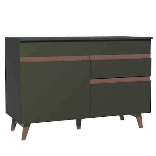 Um grande destaque são os pés em madeira maciça com acabamento em amadeirado Rustic, que conferem beleza e mais firmeza ao móvel. Além disso, acompanha tampo em MDP, que pode ser removido para a colocação de pia de 120 cm de largura por 52 cm de profundidade.