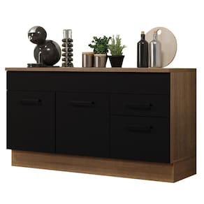 O acabamento da estrutura é em amadeirado Rustic e o das portas e frentes é preto. É feito em Pintura Poliéster com 7 camadas que protegem o móvel dos efeitos do álcool da água e do calor.