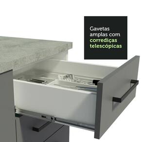 O acabamento da estrutura é branco e o das portas e frentes das gavetas é cinza. É feito em Pintura Poliéster com sete camadas, um método ecológico e que protege o móvel dos efeitos da água e do calor.