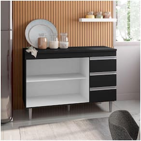 O Balcão é uma peça muito importante na cozinha, e ele possui estrutura em MDP e acabamento em pintura UV, ou seja, é uma ótima alternativa para os fãs de durabilidade e resistência. Além disso, ele também apresenta 2 portas convencionais e 3 gavetas de deslize suave e amplo espaço interno para guardar seus utensílios, te auxiliar e deixar sua rotina ainda mais dinâmica. Demais, né?