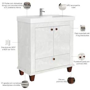 Esse gabinete para banheiro é fabricado em MDF de alta qualidade, sendo um móvel resistente e duradouro. Também possui duas portas convencionais e puxadores redondos com design requintado de fácil manuseio. Já em seu interior, possui uma prateleira interna, além da gaveta logo abaixo que conta com divisões versáteis que oferecem um espaço amplo para guardar e organizar seus itens pessoais, de modo a facilitar a sua rotina diária.