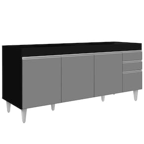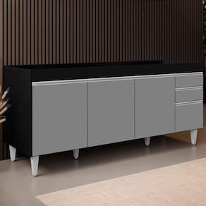 Fabricado em MDP com acabamento em pintura UV, o Balcão Gabinete Dallas Preto/Cinza é uma excelente opção para quem tem uma cozinha com amplo espaço disponível para louça, panelas e demais acessórios utilizados neste ambiente que podem ser aproveitados da melhor maneira. Além da estrutura, também conta com pés reguláveis em PVC, 4 portas convencionais com puxador em alumínio embutido e 1 prateleira interna. Além é claro, de 2 gavetas na lateral também com puxadores embutidos para facilitar o manuseio e com corrediças metálicas e espaço ótimo para guardar seus talheres e utensílios. Ah, não possui tampo, mas pode formar conjunto com tampo ou pia vendidos separadamente.