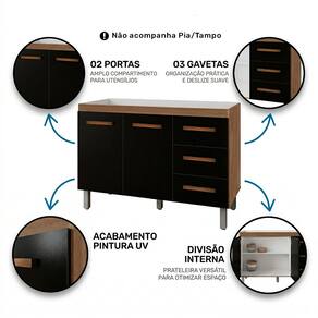 Produzido em MDP de alta qualidade e com acabamento em pintura UV, o gabinete oferece maior durabilidade e resistência ao uso diário. Seu formato compacto é perfeito para ambientes menores, enquanto as 02 portas e 03 gavetas garantem espaço suficiente para organizar utensílios, panelas e mantimentos com facilidade.