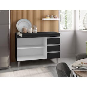 Possui excelente espaço interno para armazenar os utensílios necessários, ela conta com 02 portas, 03 gavetas, pés de pvc regulável, puxadores de alumínio, dobradiças e corrediças metálicas e com um excelente acabamento com pintura uv brilho para maior durabilidade do móvel.