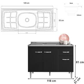 Dimensões do Balcão: Altura: 80 cm Largura: 118 cm Profundidade: 51 cm Dimensões da Pia e Cuba: Altura: 13,5 cm Largura: 120 cm Profundidade: 53 cm