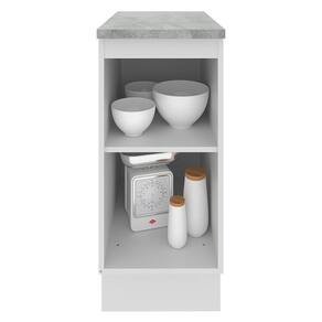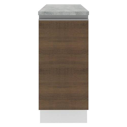 - Internamente possui 1 prateleira e contempla o tampo do balcão. Os pés são em PVC com regulagem de altura e rodapé removível de madeira de fácil encaixe.