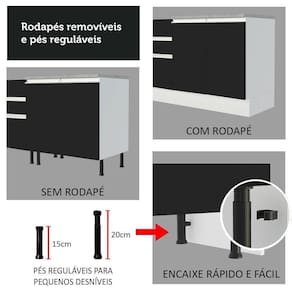 Possui uma porta convencional com puxador em alumínio e dobradiças metálicas com amortecimento para o fechamento suave. Internamente tem uma prateleira e contempla o tampo do balcão. Os pés são em PVC com regulagem de altura e rodapé removível de madeira de fácil encaixe.