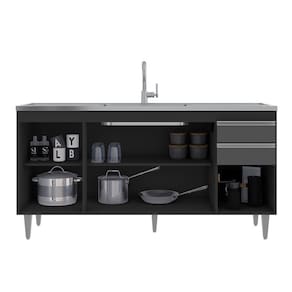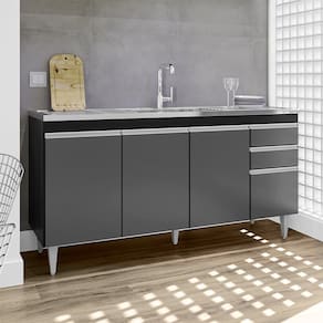 Características: Estrutura em MDP 15mm; Acabamento em melamina BP; Possui 4 portas com dobradiças metálicas; Possui 2 gavetas com corrediças metálicas; Possui 6 pés em PVC com regulagem de altura; Puxadores em alumínio; Amplo espaço interno; Pia produzida em aço inox e concreto aerado; Canais da pia inclinados; Superfície da pia plana; Furo para fixação da torneira; Peso suportado: 40 kg distribuídos; ACOMPANHA PIA E CUBA.