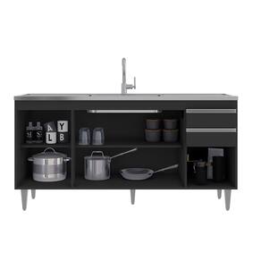 Características: Estrutura em MDP 15mm; Acabamento em melamina BP; Possui 4 portas com dobradiças metálicas; Possui 2 gavetas com corrediças metálicas; Possui 6 pés em PVC com regulagem de altura; Puxadores em alumínio; Amplo espaço interno; Pia produzida em aço inox e concreto aerado; Canais da pia inclinados; Superfície da pia plana; Furo para fixação da torneira; Peso suportado: 40 kg distribuídos; ACOMPANHA PIA E CUBA.