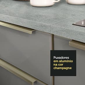O vidro cinza aplicado na porta é muito bonito e sofisticado. Além disso, o móvel é desenvolvido com materiais de alta qualidade, como puxadores em alumínio e dobradiças com amortecimento, diferenciais que aumentam a vida útil do produto.