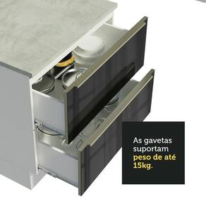 Um grande destaque é o vidro preto aplicado na porta, muito bonito e sofisticado. Para completar, é desenvolvido com materiais de alta qualidade, como puxadores em alumínio e corrediças telescópicas, diferenciais que proporcionam maior durabilidade ao produto.