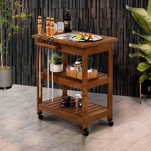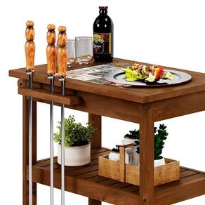 Apresentamos o Balcãozinho Móvel com Acabamento Natural, feita em madeira maciça para durabilidade. Seu acabamento com cera realça sua beleza. Com detalhes encantadores, como o tampo adornado com cerâmica, a mesa agrega charme ao ambiente. Além disso, possui suporte para espetos, gaveta e porta toalha para praticidade. Com ferragens em metal e rodízios para mobilidade, é uma combinação perfeita de elegância e funcionalidade.