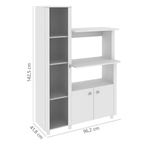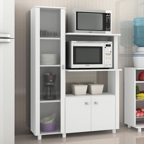 Características: Estrutura em MDP Acabamento em Pintura UV 03 Portas com Dobradiças Metálicas Prateleiras Internas com Amplo Espaço Porta Lateral com Vidro Espaço para Forno e Microondas Pés e Puxadores em Plástico Peso Suportado 14kg Tampo e 3kg cada Prateleira
