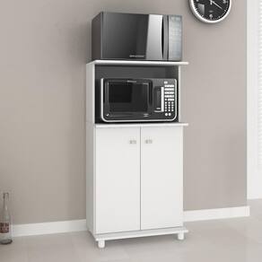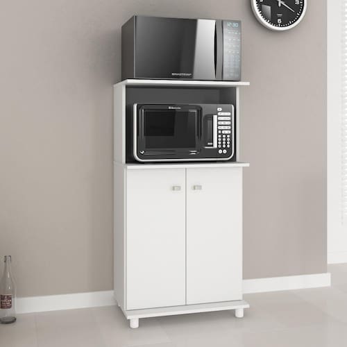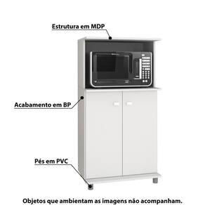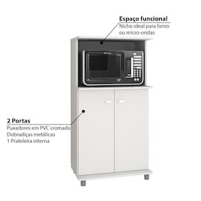 Características - Cor: Branco. - Estrutura em MDP 15mm e fibra 3mm (costas). - Acabamento em BP. - 2 Portas. - 1 Nicho. - 1 Prateleira interna. - Puxadores em PVC cromado. - Dobradiça Metálica. - Espaço para forno ou micro-ondas. - Pés em PVC. - Suporta: 15 kg no topo/ 3 kg na prateleira. - Móvel entregue desmontado.