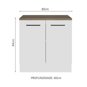 O móvel acompanha ainda tampo resistente em MDP e os pés são reguláveis em PVC, com rodapé removível para facilitar a limpeza.